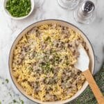 - Combine with Noodles and Beef: Reduce heat to low, add the cooked egg noodles and browned ground beef to the skillet, and stir to combine and heat through.