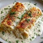 Two thick rolled crepes are on a white plate, covered with a creamy white sauce that is smooth with small black pepper bits and fresh green herbs sprinkled on top and around. The crepes have a golden-brown, lightly charred layer, showing a crispy texture on the surface, while the inside looks soft and filled with more creamy white sauce. The sauce pools slightly on the white plate, making a rich and inviting look. The background shows a white marbled texture. photo taken with an iphone --ar 4:5 --v 7