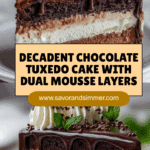 A decadent and elegant Chocolate Tuxedo Cake featuring rich chocolate cake layers, silky white and dark chocolate mousses, and a glossy chocolate ganache topping. This cake is perfect for special occasions and chocolate lovers who appreciate a sophisticated dessert combining moist cake with light, creamy mousse fillings and a smooth ganache finish.