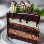 A slice of rich layered chocolate cake sits on a white plate against a white marbled background. The cake has five visible layers: the bottom and third layers are dark, moist chocolate cake, the second layer is a thick, creamy milk chocolate mousse, the fourth layer is a smooth white cream, and the top layer is dark chocolate cake covered with glossy, dark chocolate ganache that drips slowly down the sides. On top, there are three tall swirls of white whipped cream, sprinkled with small chocolate shavings, each topped with a small green mint leaf. The lighting highlights the shiny texture of the ganache and the soft, fluffy layers below. photo taken with an iphone --ar 4:5 --v 7