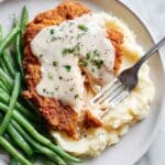 A white plate on a white marbled surface holds a three-part meal. On the left is a piece of crispy fried chicken covered with a thick layer of creamy white gravy sprinkled with black pepper and chopped green herbs, with a fork cutting into the chicken showing the tender inside. To the right is a smooth mound of creamy light beige mashed potatoes, and below it are bright green steamed green beans with a slight shine, arranged neatly. Photo taken with an iphone --ar 4:5 --v 7