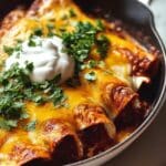 This recipe for Delicious Chicken Enchiladas features tender shredded chicken tossed in flavorful spices and red enchilada sauce, rolled in soft flour tortillas, topped with melted Monterey Jack cheese, and baked to bubbly perfection. A comforting Mexican-inspired dish perfect for family dinners or gatherings, garnished with fresh cilantro and served with tangy sour cream.