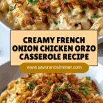 Keywords: French onion chicken casserole, orzo casserole, comfort food, baked chicken casserole, creamy orzo recipe