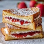 Delight in these Fried Strawberry Cheesecake Sandwiches, featuring creamy sweetened cream cheese, fresh strawberries, and strawberry jam sandwiched between brioche slices, then fried to golden perfection. A perfect indulgent treat for a sweet snack or dessert.