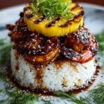 - Assemble the Stack: Spoon a portion of cooked white rice onto each plate, layer with a grilled chicken piece, top with a caramelized grilled pineapple ring, then drizzle generously with the thickened glaze. Garnish with sliced green onions and sprinkle sesame seeds on top to finish.