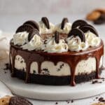 A decadent and creamy no-bake Oreo cheesecake featuring a crunchy Oreo cookie crust, a smooth cream cheese filling studded with Oreo pieces, and topped with rich chocolate ganache and whipped cream swirls decorated with mini Oreo cookies. This easy-to-make dessert requires no baking and is perfect for Oreo lovers looking for a luscious treat.