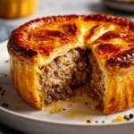 Traditional Scottish Scotch Pie featuring a hearty spiced lamb filling encased in a rich, buttery hot water crust pastry. Perfectly baked to a golden brown, this savory pie is a classic comfort food ideal for any occasion.