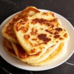The image shows a stack of four square-shaped flatbreads with a golden-brown toasted surface, arranged slightly unevenly on a white plate. Each flatbread has patches of darker brown spots from cooking, giving a crispy texture contrast to the softer, lighter yellow parts. The flatbreads are thick and fluffy, with soft edges that are slightly rounded. The plate is placed on a white marbled textured surface, creating a clean and simple background that highlights the warm colors and texture of the bread. photo taken with an iphone --ar 4:5 --v 7