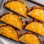 These Sheet Pan Tacos offer a quick and delicious way to enjoy flavorful ground beef tacos with minimal cleanup. Ground beef is cooked with onion and taco seasoning, then topped with cheese on oil-brushed tortillas and baked to crispy perfection on a sheet pan. Perfect for an easy weeknight dinner or casual gatherings.
