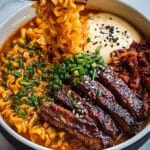 PrintSpicy Korean Ramen with Grilled Beef & Creamy Sauce Recipe