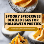 Keywords: deviled eggs, Halloween appetizer, spiderweb eggs, spooky snack, party food