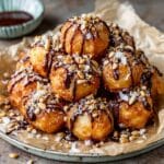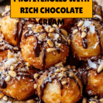 This recipe combines light, airy choux pastry shells filled with a rich vanilla cream and layered with a luscious homemade chocolate cream. The delicate profiteroles are baked to golden perfection, filled with a smooth vanilla filling mixed with whipped cream, and served generously coated in silky chocolate cream. Ideal as an elegant dessert to impress guests or to enjoy a luxurious treat at home.